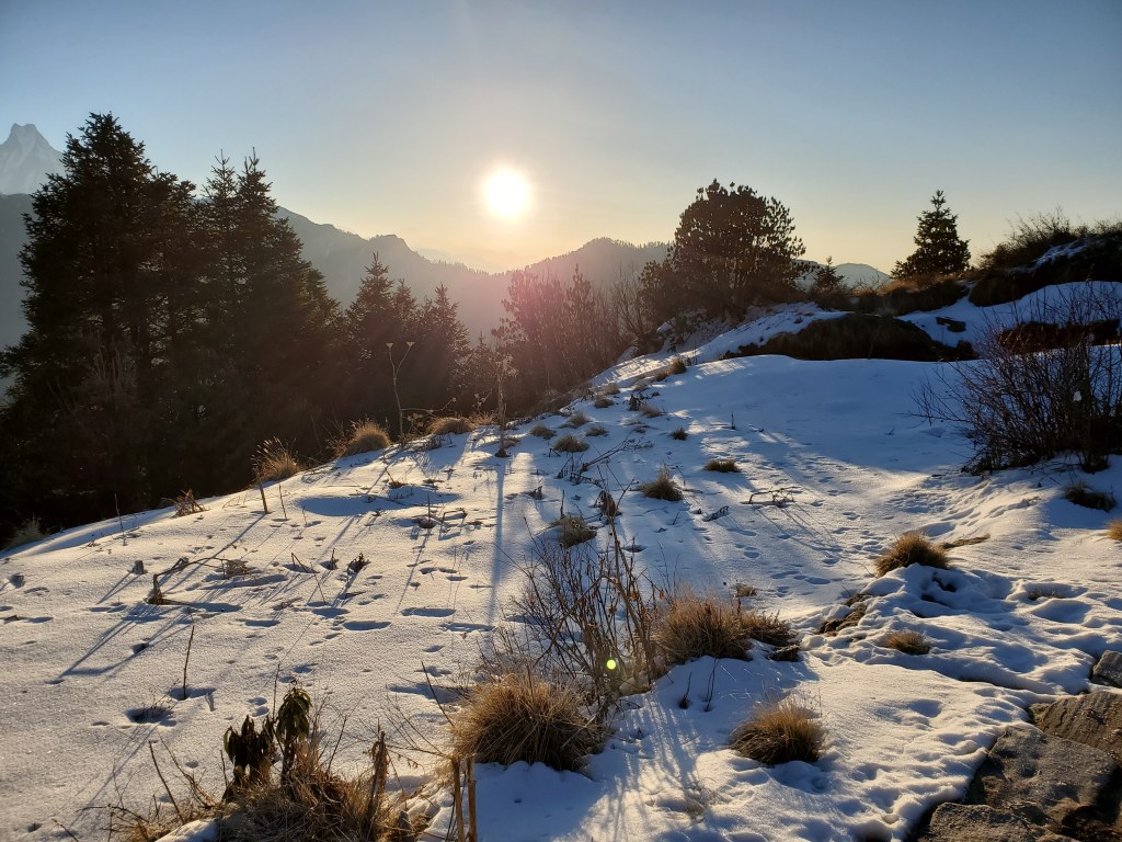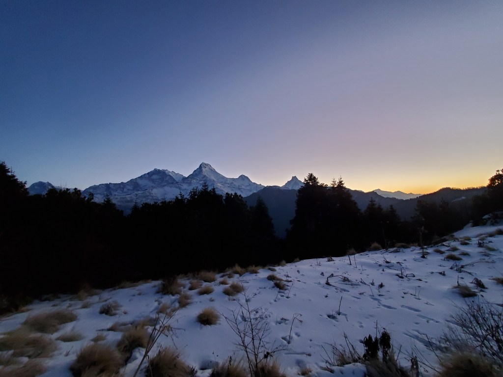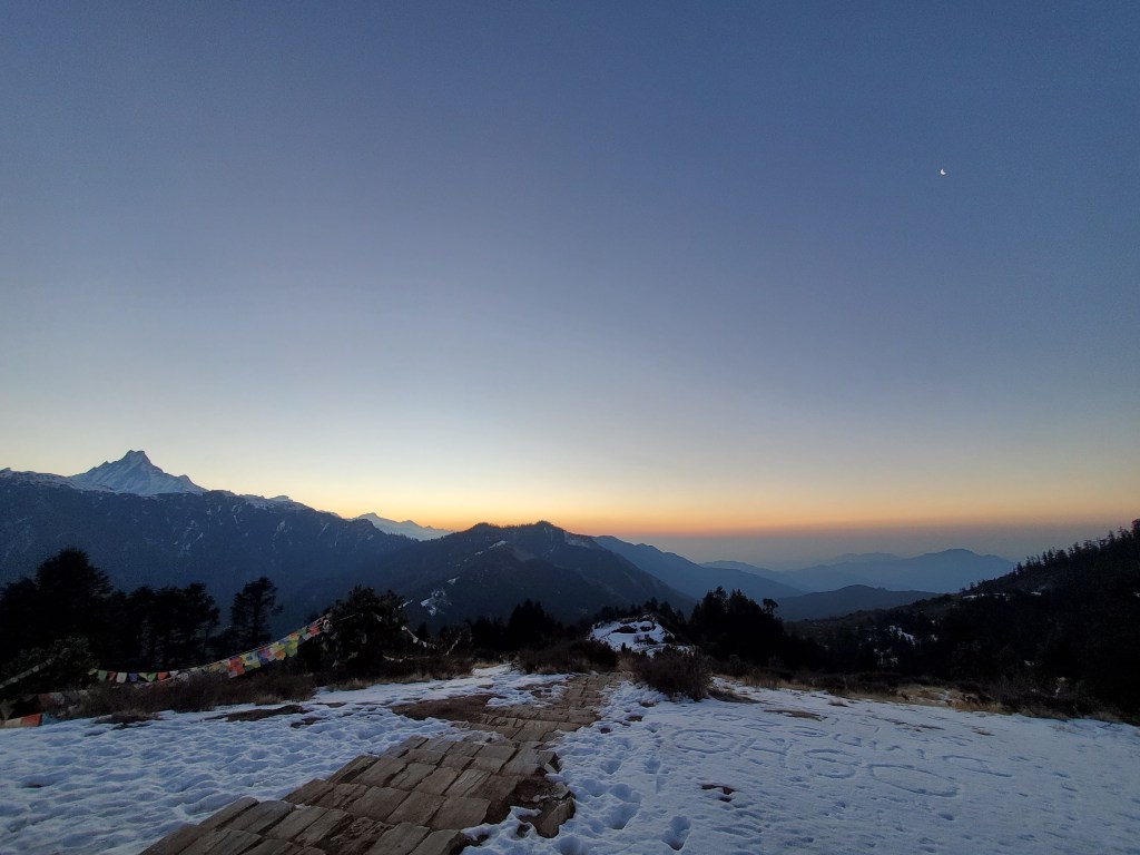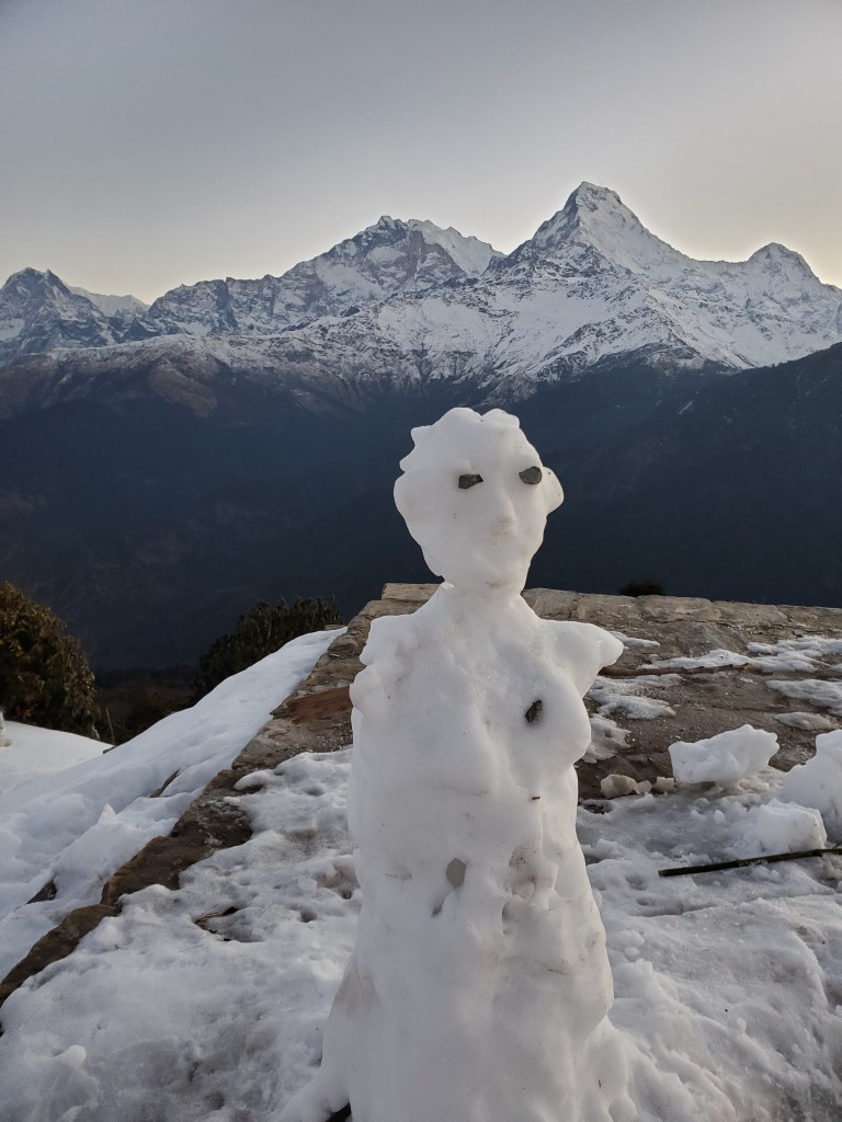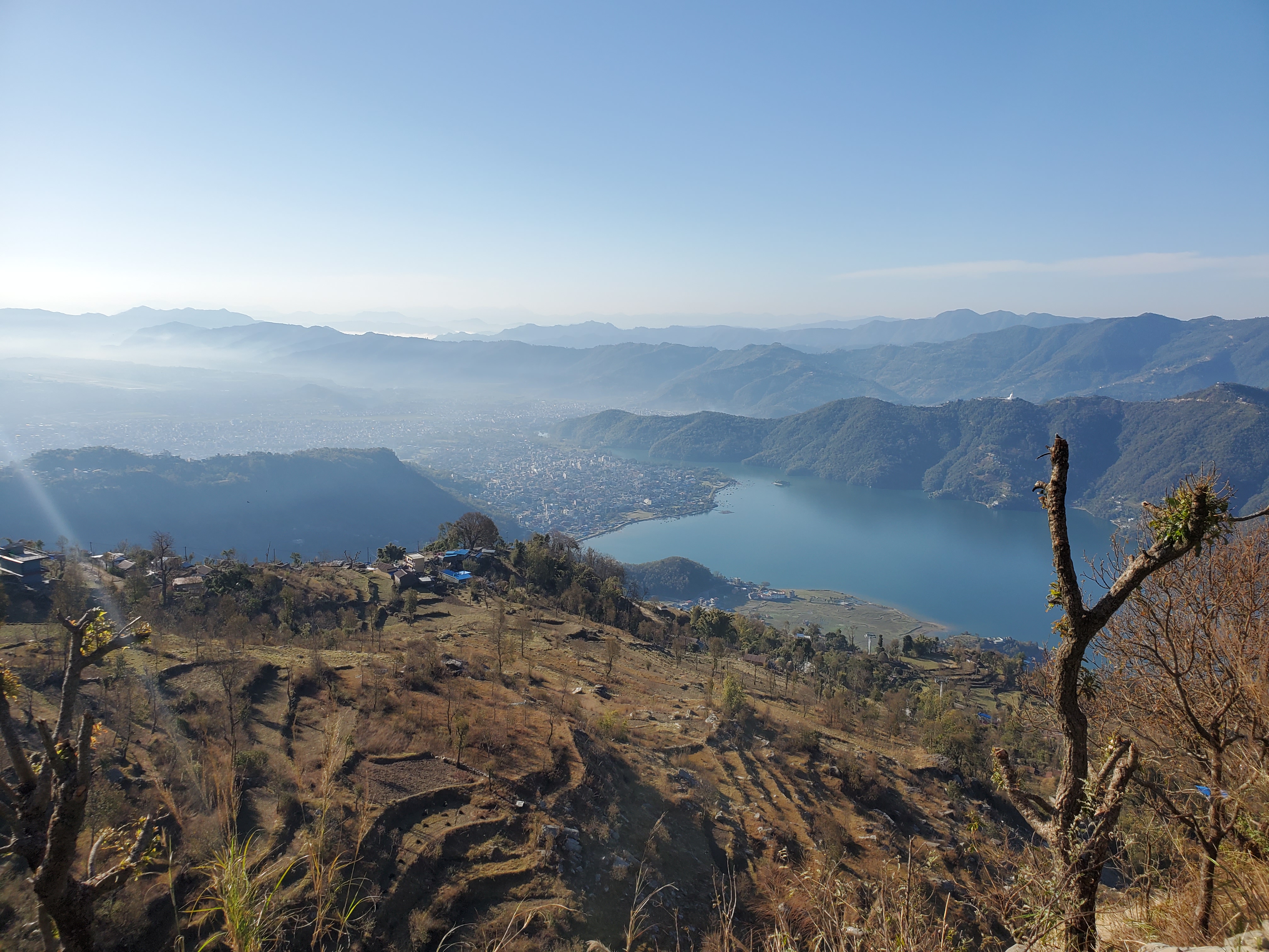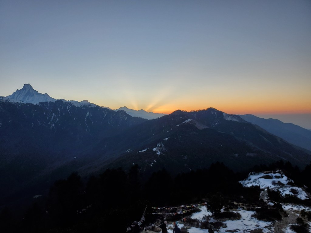 Hiking day 4&5: Downhill sounds great until its three plus hours downhill in the ice and snow on a narrow path with a sheer drop to the valley below. This was by far the most difficult day of them all! Man, just when you think we are on the way down and things will be chill then boom, Snow and Ice. What made this more difficult is the fact that in order to maintain balance I had to basically walk the entire three hours with every muscle in my body tensed! By the time we reached our destination I was so sore and too exhausted to come down for dinner. I simply had potatoes in my room. After I ate my potatoes, I piled the two bulky blankets over me (it was freezing, and I had no heat) and passed out. I woke early to a beautiful sunrise just outside my window. Yup it was worth it. On my last day in the mountains we just had a short hike over to the bus that would drive us down the hill where we would hop a car back to Pokhara for a free relaxing day where I would take my boat ride and go paragliding. I had made it! my heart smiled.