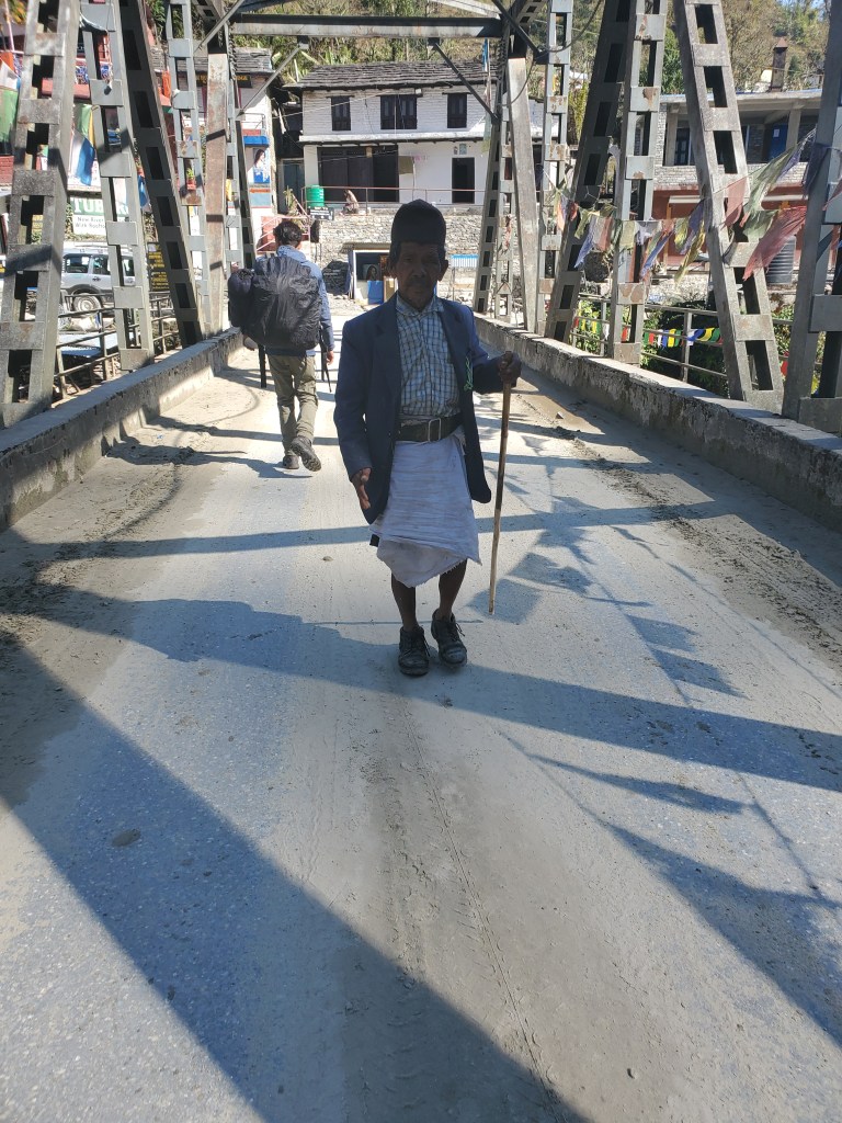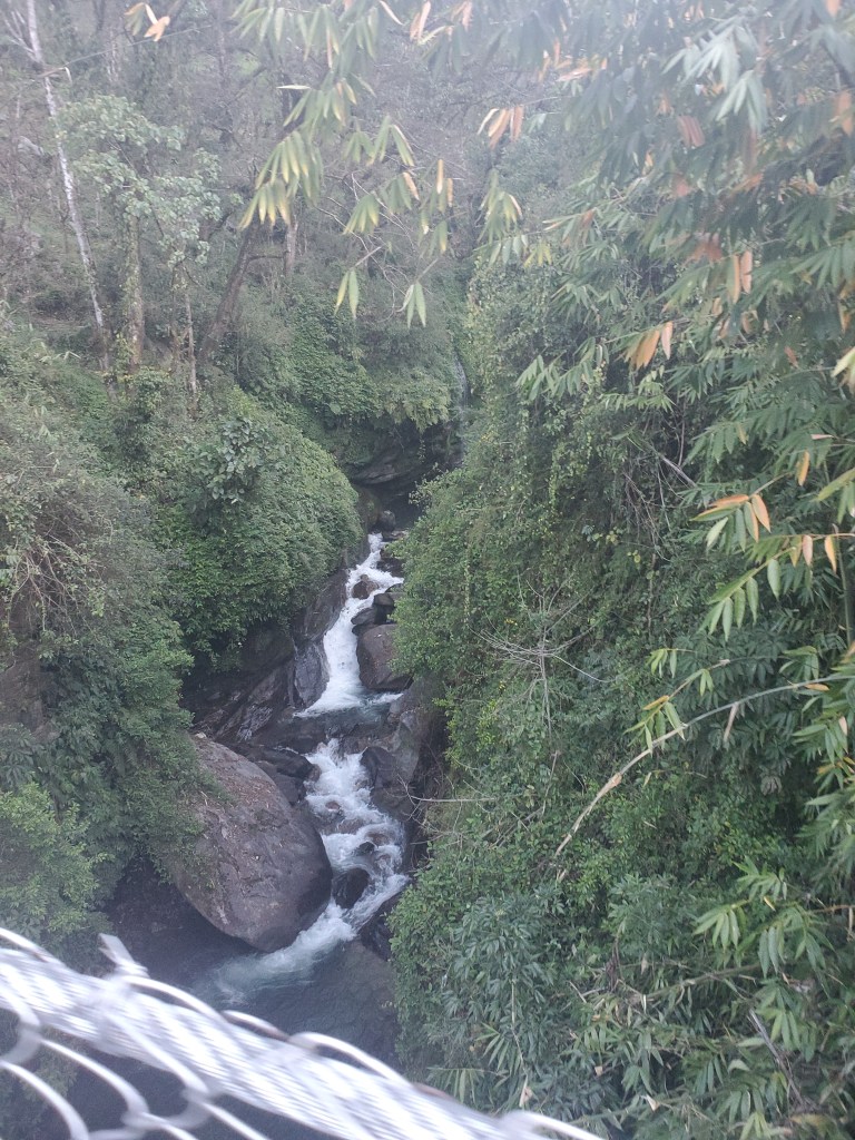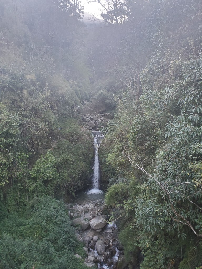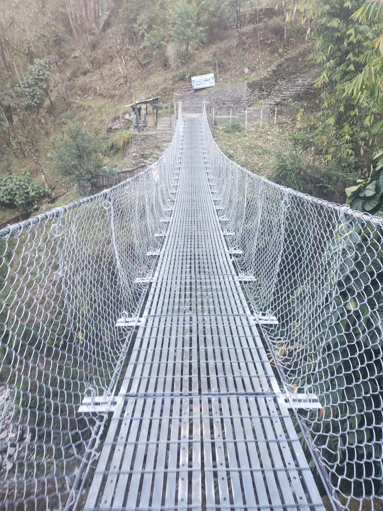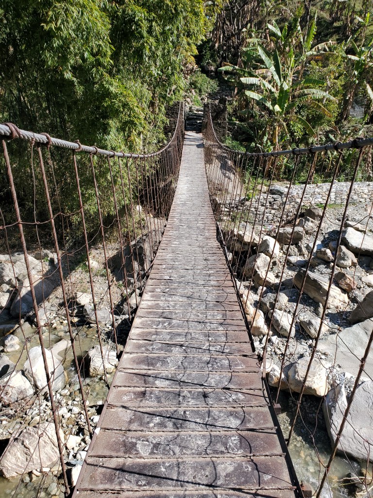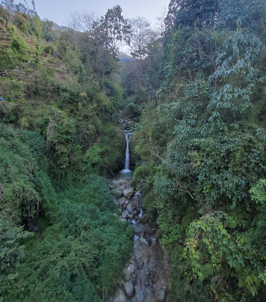 Hiking day 1: Started with a lovely stroll through the village of Lumle and a twenty-minute walk to Birethani a busy town with lots of shops and restaurants. The trail followed the main road until it reached a cool suspension bridge that crossed a quick moving river. The bridge took us to a path lined with bamboo at the start but continued uphill with a wide variety of trees that I had never seen before. In the distance as we walked, I saw a large waterfall, beautiful pastures, and terraced farms. After a couple hours we stopped in an area called Sudami for lunch. I had some amazing lemon tea with mint and some tasty chicken stir-fry. I was feeling good enjoying the cool breeze as I sipped my tea and enjoyed my food. I was so caught up in the moment that I made small yet kinda big miscalculation. See I had been sipping quite a bit of water as were hiked to our lunch spot and I drank two delightful cups of tea but for some reason I totally forgot to hit the loo before we got underway. About fifteen to twenty minutes into our assent up the next hill it became abundantly clear I had made a grave mistake! I took a pause to collect myself and to let Rajan know. He reassured me and said there was a place for me to go just about fifteen minutes or so ahead of us. I was good with that, I felt that I would have no problem making that. Except that at about minute fourteen and a half minutes as I walked up and put my had on the knob of the door to the potty and the panic to pee urge hit me! I made it into the bathroom to the toilet but had no time to pull down me trousers! Ugh! This was not a great start to my trek. I sat there for a moment gathering myself and my thoughts. After about a minute I opened my backpack and fished out a pair of camo leggings and undies. I did a quick wash up in the sink tossed the soiled clothes out threw my pack on and emerged from that tiny little room energized and ready for the rest of my three-hour uphill hike! When we finally reached the little village, we would be staying in overnight I basically had dinner chatted with Rajan and the kids in the village for a few and then I was off to bed.