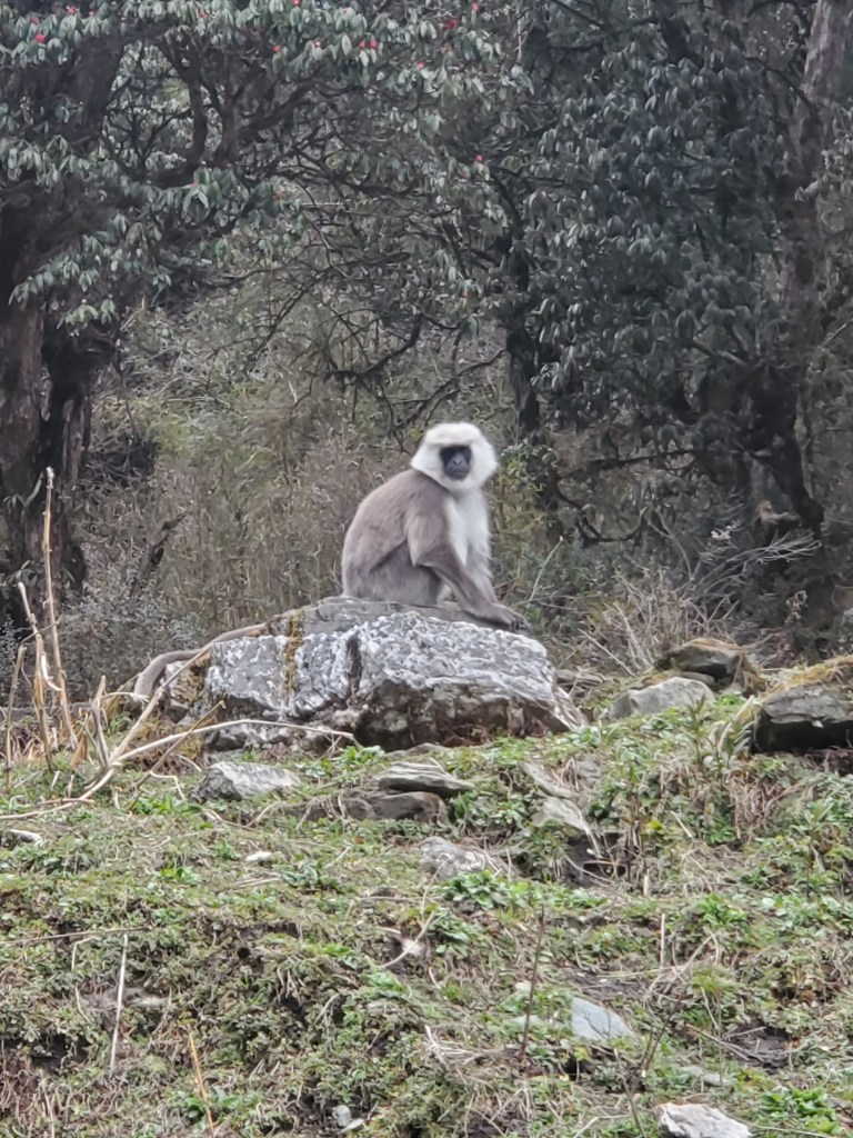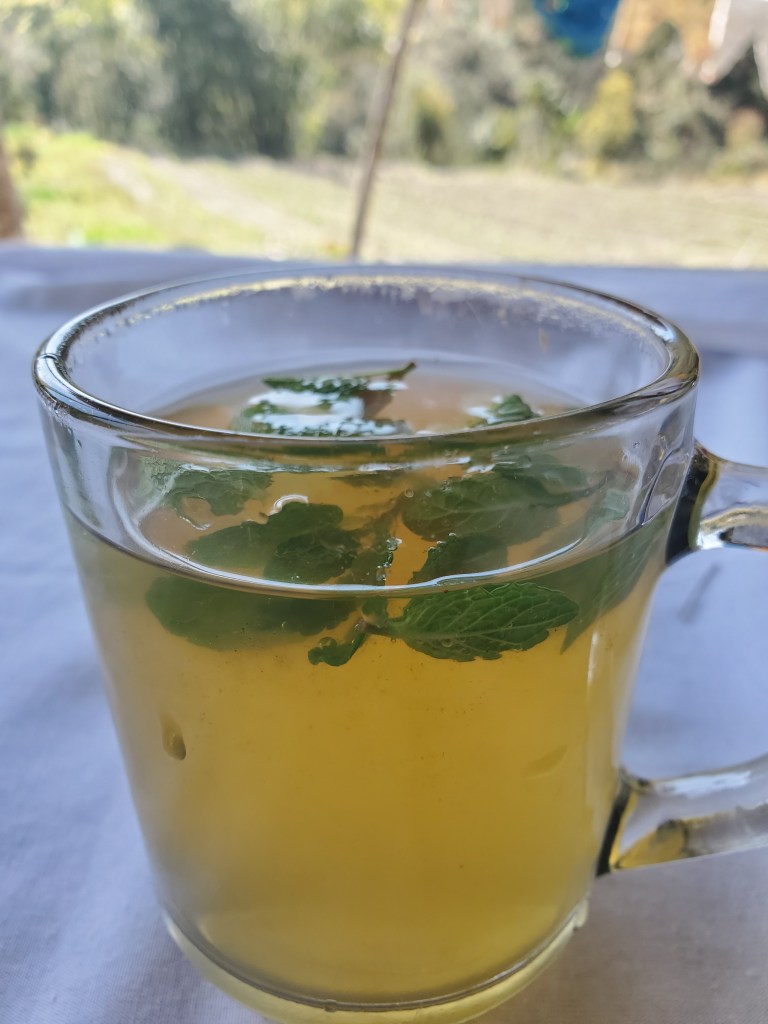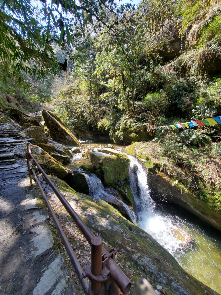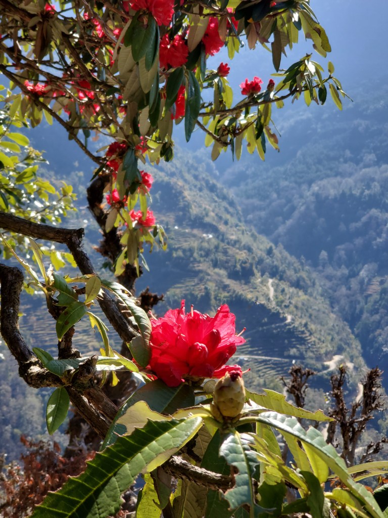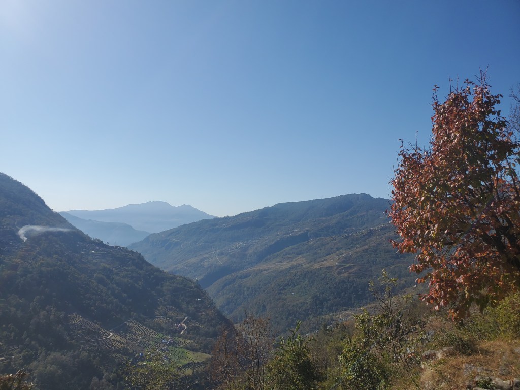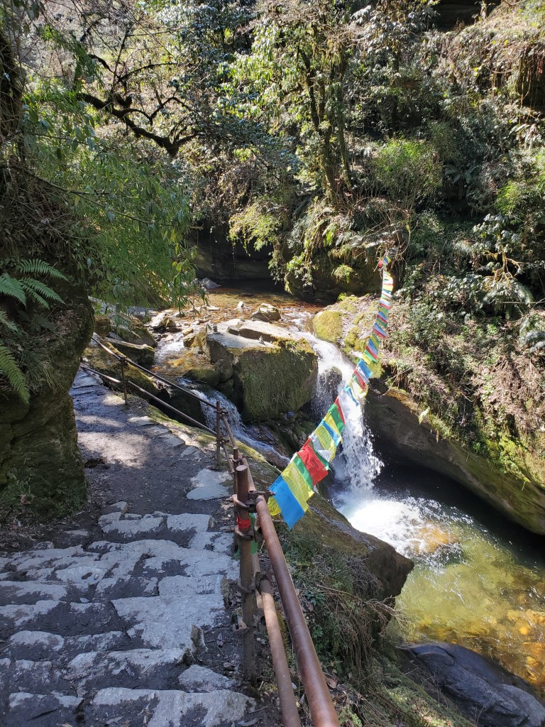 Hiking day 1: Started with a lovely stroll through the village of Lumle and a twenty-minute walk to Birethani a busy town with lots of shops and restaurants. The trail followed the main road until it reached a cool suspension bridge that crossed a quick moving river. The bridge took us to a path lined with bamboo at the start but continued uphill with a wide variety of trees that I had never seen before. In the distance as we walked, I saw a large waterfall, beautiful pastures, and terraced farms. After a couple hours we stopped in an area called Sudami for lunch. I had some amazing lemon tea with mint and some tasty chicken stir-fry. I was feeling good enjoying the cool breeze as I sipped my tea and enjoyed my food. I was so caught up in the moment that I made small yet kinda big miscalculation. See I had been sipping quite a bit of water as were hiked to our lunch spot and I drank two delightful cups of tea but for some reason I totally forgot to hit the loo before we got underway. About fifteen to twenty minutes into our assent up the next hill it became abundantly clear I had made a grave mistake! I took a pause to collect myself and to let Rajan know. He reassured me and said there was a place for me to go just about fifteen minutes or so ahead of us. I was good with that, I felt that I would have no problem making that. Except that at about minute fourteen and a half minutes as I walked up and put my had on the knob of the door to the potty and the panic to pee urge hit me! I made it into the bathroom to the toilet but had no time to pull down me trousers! Ugh! This was not a great start to my trek. I sat there for a moment gathering myself and my thoughts. After about a minute I opened my backpack and fished out a pair of camo leggings and undies. I did a quick wash up in the sink tossed the soiled clothes out threw my pack on and emerged from that tiny little room energized and ready for the rest of my three-hour uphill hike! When we finally reached the little village, we would be staying in overnight I basically had dinner chatted with Rajan and the kids in the village for a few and then I was off to bed.