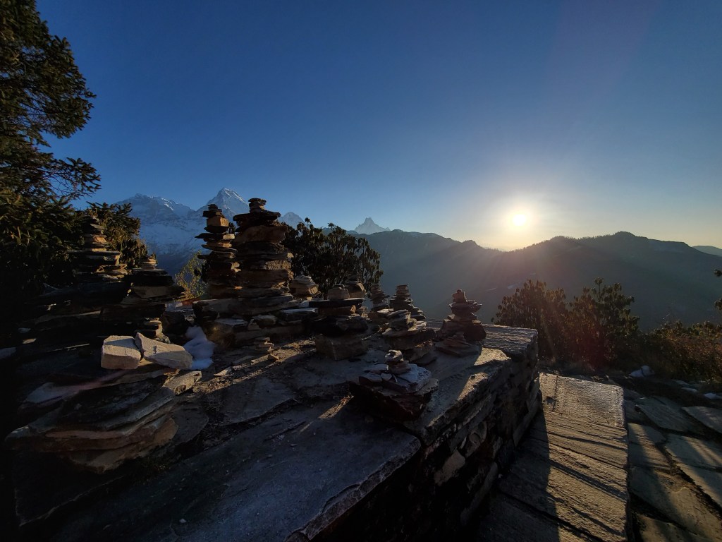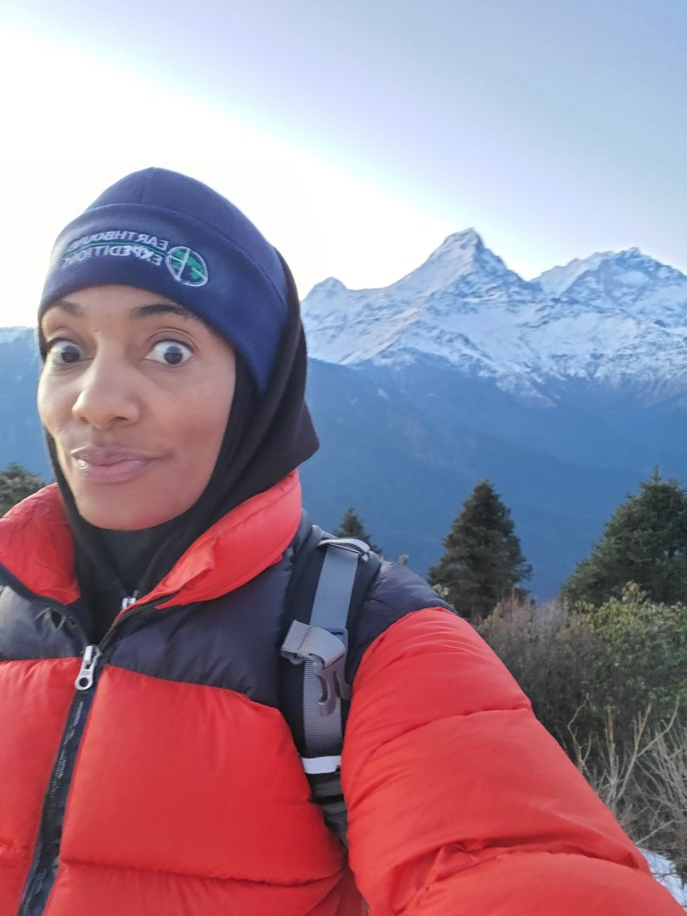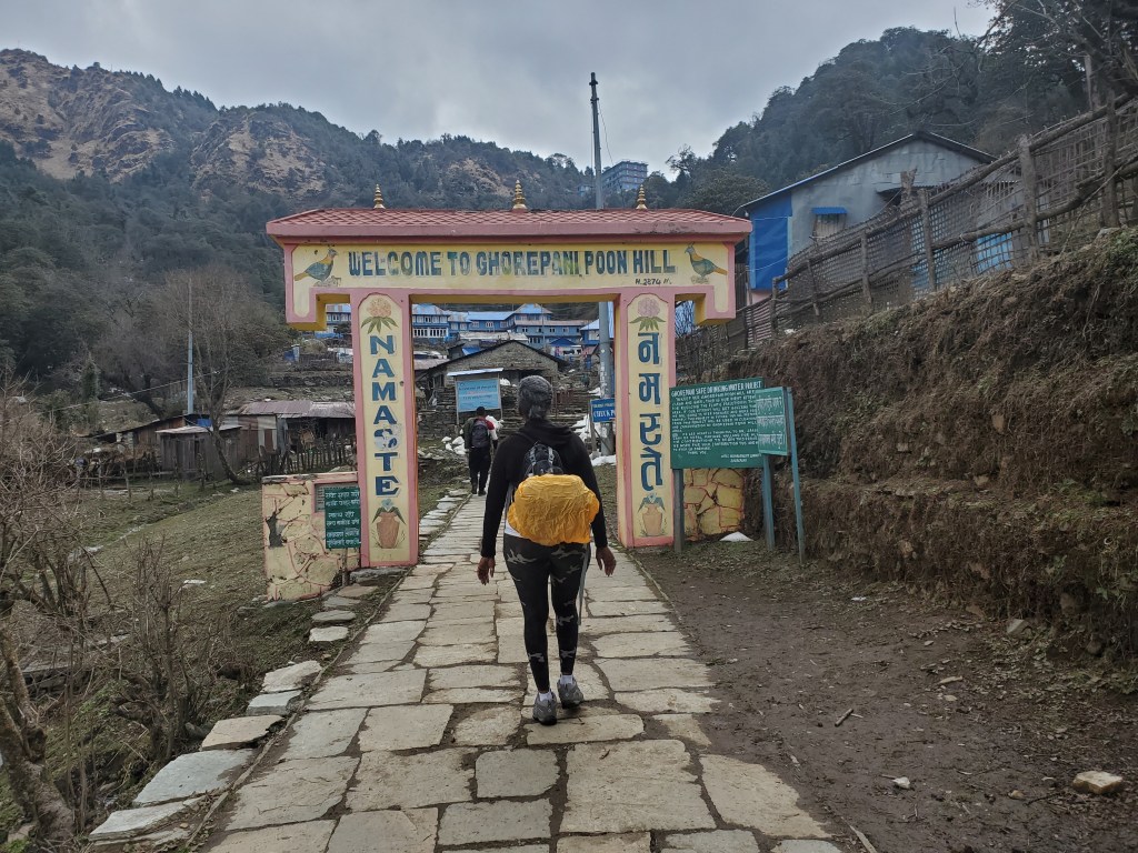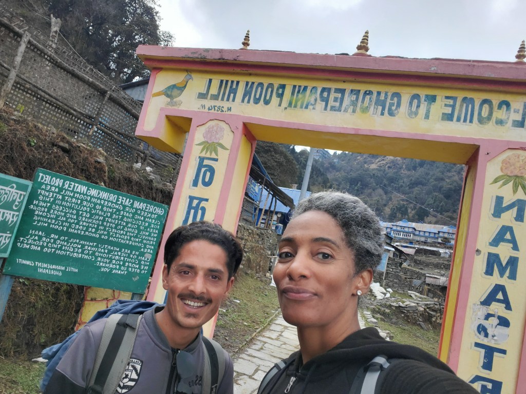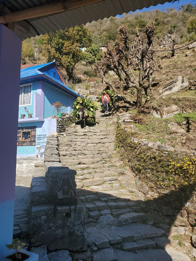 Hiking day 2&3: I had eggs and toast for breakfast then quickly grabbed my pack and we were off! This was when ish got real! We were hiking through some very picturesque places. That morning the start was cool and beautiful but after a short hike we came to the start of what is estimated to be over 3300 steps up to a height of about 2100m which is just shy of 7000ft and that wasn’t even the halfway point. By the end of the day we would have hiked for over 7 hours reaching a final altitude of 2800m or 9200 ft in Ghorepani. Somewhere along the way breathing became an issue. Physically I felt fine, even throught the 3300 steps I was fine but as the day wore on, I would have to take small breathing breaks every so often. This continued the next day when we woke up at zero dark thirty to hike up Poonhill. We were up so we could watch the sun rise over the Himalayas. Again, physically my body was good to go but it seriously felt as if oxygen was only being taken in during every third breath. Slow and steady wins the race though so I paused when I needed more air and then I continued forward until I reached the top! It was beautiful! Well it was also freezing but mostly beautiful and totally worth it. I decided that I would simply have to adjust my pacing, but I would absolutely make all the hikes. After we hiked back from Poonhill we had breakfast and hit the trails again. This time we were to be heading to lower elevations, so I was ready.