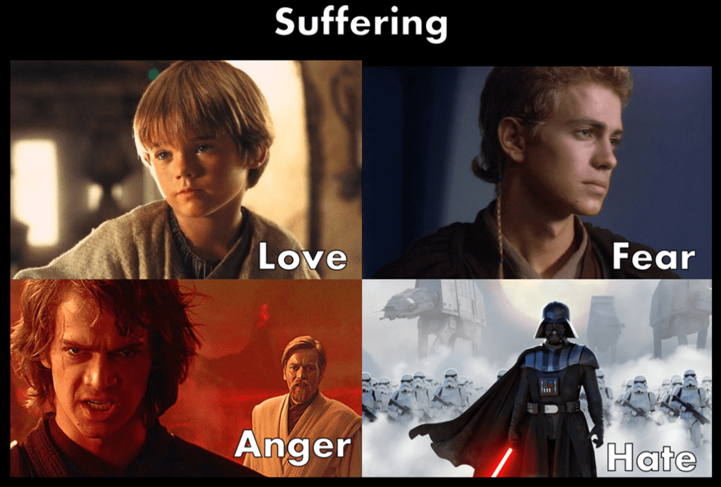 It’s odd how important the role of love is in generating strongly ( and sometimes hatefully) divided humans. Yoda said it best; “Love is the path to the dark side. Love leads to fear. Fear leads to anger. Anger leads to hate. Hate leads to suffering”(it’s almost what he said). I feel like this is what he really meant though, honestly. Anakin’s strong attachment and love for his mother and Padma created fear, anger, and eventually the hate that lead Anakin to kill all the younglings and skedaddle on over to the dark side. The value he placed on the lives of the two women he loved far our weighed that of all younglings, the Jedi, and anyone else in the galaxy. He did not care that there may have been someone who loved the individuals he destroyed. That they were someone’s children, family, or friends. All that mattered were HIS feeling and HIS people and he could justify even killing innocent men, women, and children to save his family. While most cases are not to that extreme a lot of human divisiveness is caused by love. It may sound twisted and sometimes it is, but the idea is that the love that I have for my family and my people gives them a higher value on my personal humanity scale. Think about it when the covid virus hit or any natural disaster like the snow and ice that recently hit Texas and other parts of the country, the stores were nearly cleaned out. Not really because we were about to be shut down for a month with no access to stores, usually it’s simply that we want to get as much as we can for our family just in case. People will stockpile waaaaay more than what’s needed and will even prevent others from having anything even something as simple as tissue just so we have 80 backup rolls. With no concern for how our ability to have more may prevent others from having any. Is that a true act of love?